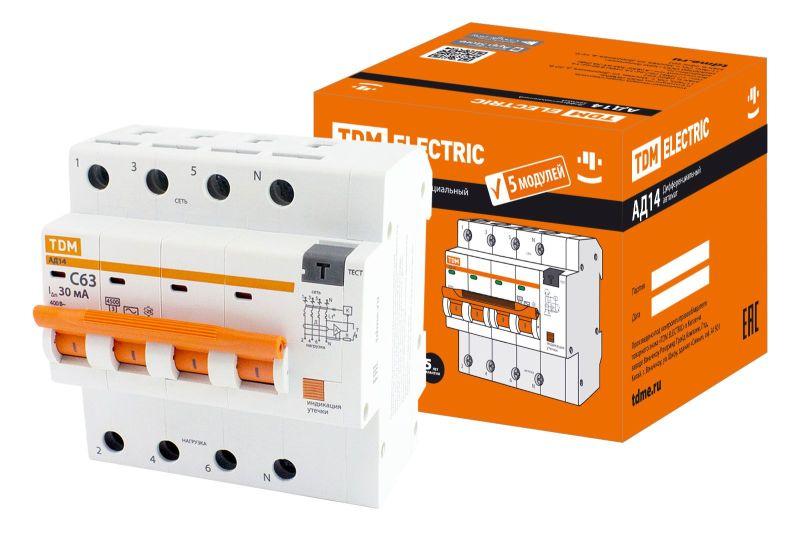 ДИФФЕРЕНЦИАЛЬНЫЙ АВТОМАТ 4P C63 30мА АД-14 TDM (Отключение тока утечки и тока перегрузки)