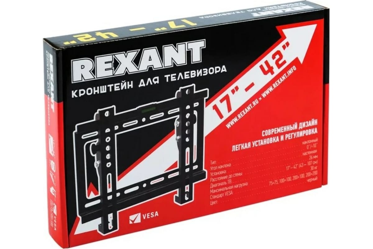 КРОНШТЕЙН ЖК 17-43" наклонный, VESA 50*50, 75*75, 100*100, 200*200 REXANT ЧЕРНЫЙ