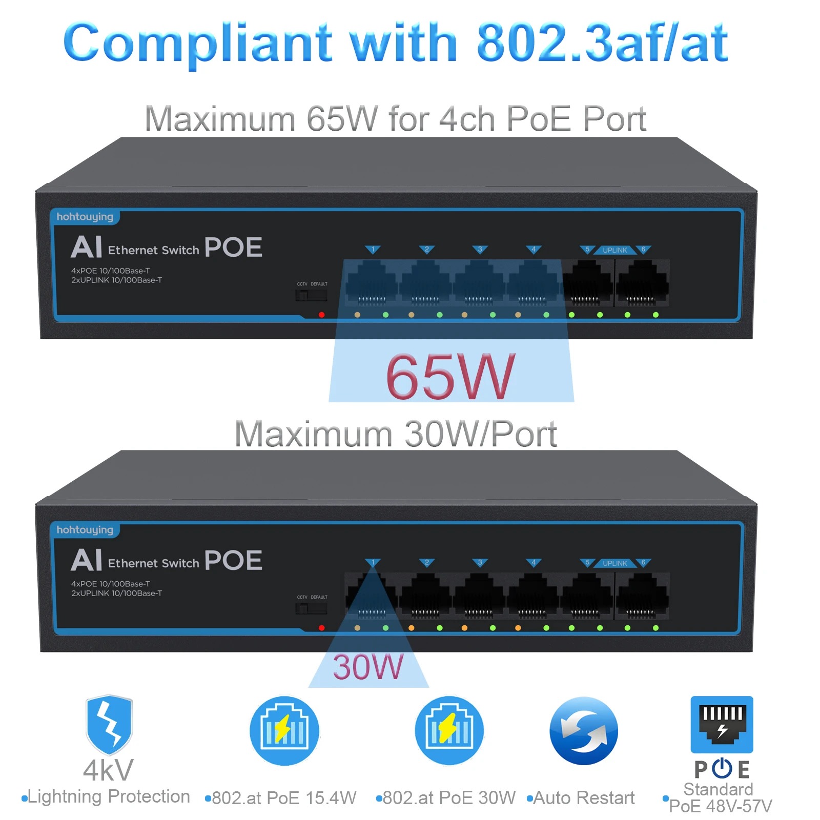 КОММУТАТОР LAN 4+2-портов POE, 4-POE+2-UPLINK, Model:SF09P, встроеный блок питания
