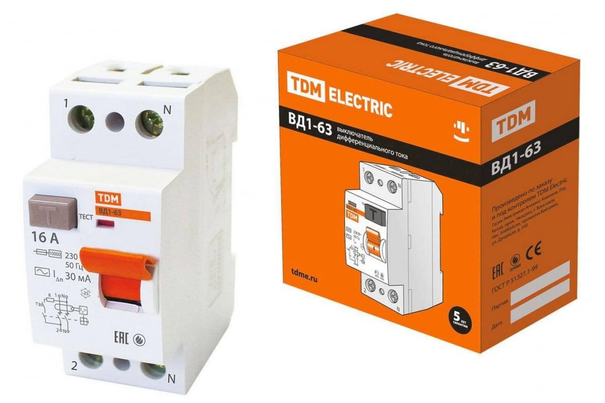ВЫКЛЮЧАТЕЛЬ ДИФФЕРЕНЦИАЛЬНЫЙ УЗО TDM ВД1-63 2Р 16А 30мА (Только отключение тока утечки)