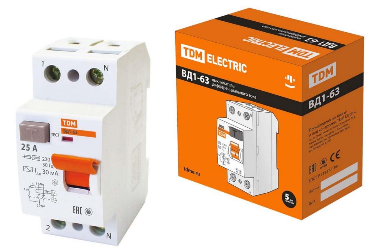 ВЫКЛЮЧАТЕЛЬ ДИФФЕРЕНЦИАЛЬНЫЙ УЗО TDM ВД63 2Р 25А 30мА (УЗО ЭЛЕКТРОННОЕ)