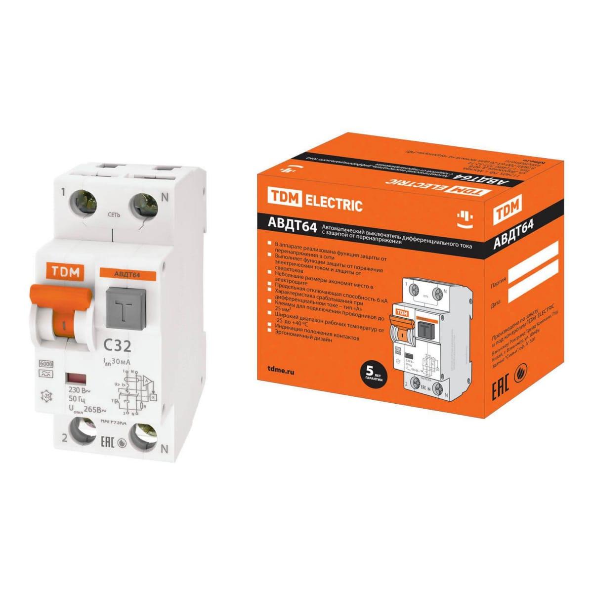 ДИФФЕРЕНЦИАЛЬНЫЙ АВТОМАТ 2P C32 30мА АВДТ-64 TDM (Отключение тока утечки и тока перегрузки)