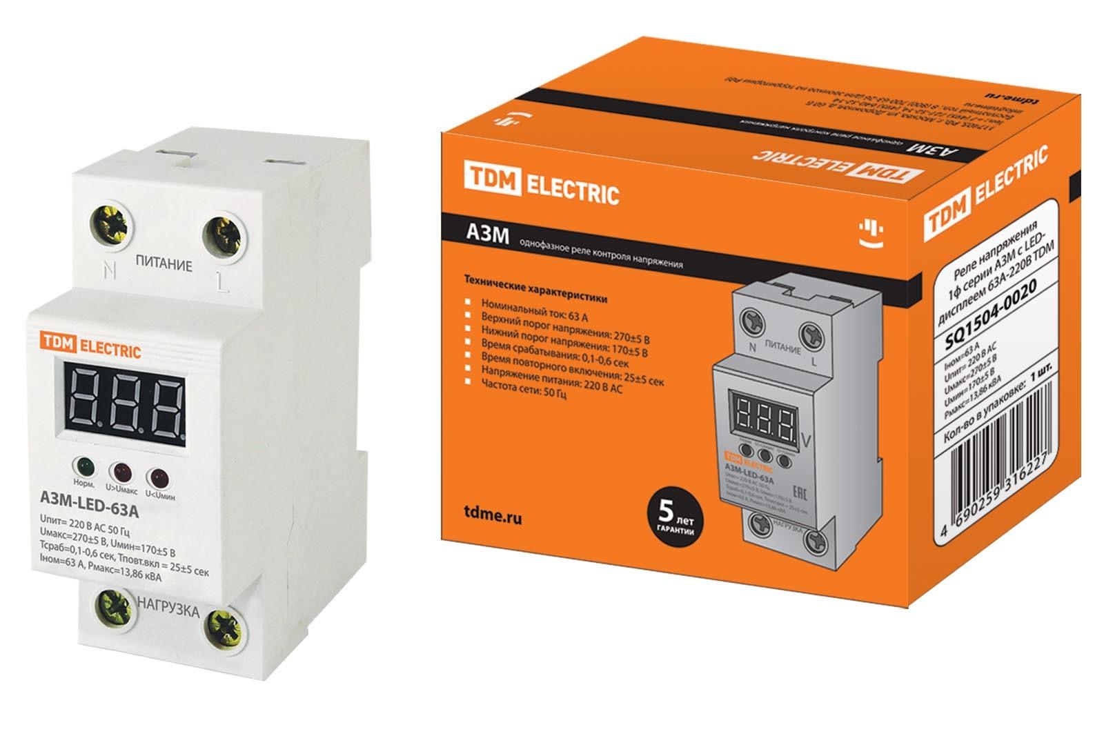 РЕЛЕ НАПРЯЖЕНИЯ НА DIN-РЕЙКУ АЗМ LED-63А-220В TDM с вольтметром