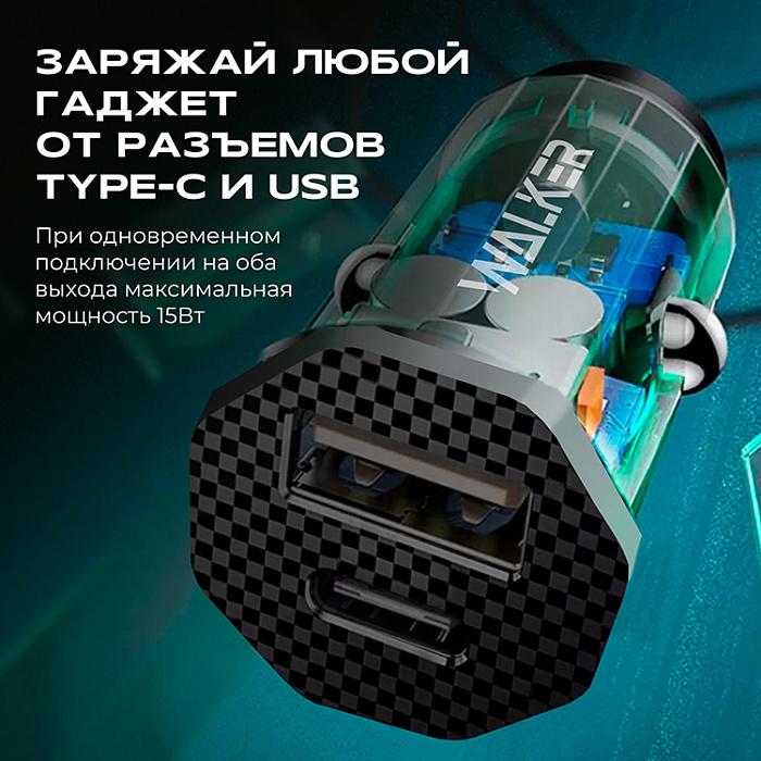 АДАПТЕР ПИТАНИЯ В ПРИКУРИВАТЕЛЬ 5.0V 3.0A USB(F)*1 + Type-C(F), QC3.0 30Вт WALKER WCR-61 ЧЕРНЫЙ