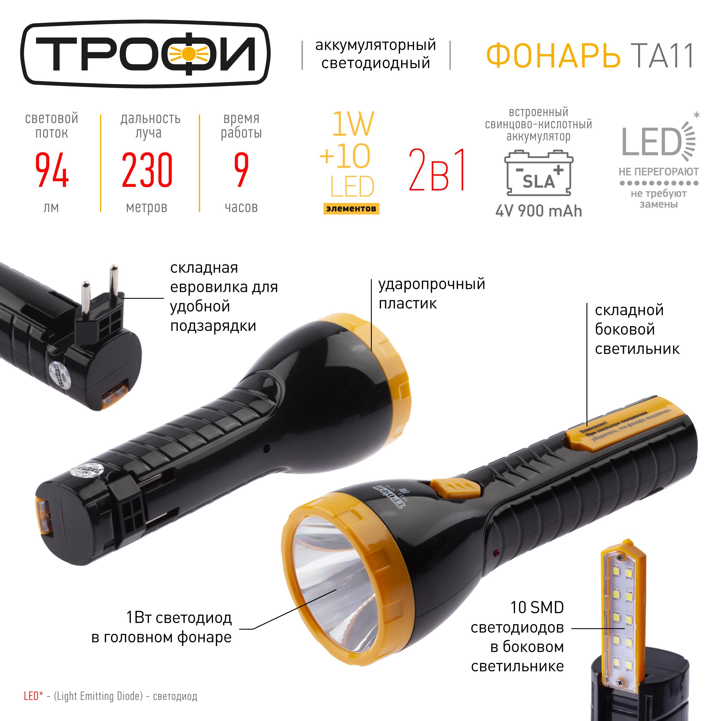 ФОНАРЬ АККУМ. ТРОФИ TA11 4V1Ah, 41W+10SMD, 2режима, складная евровилка