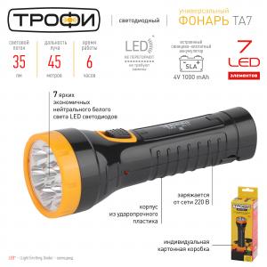 ФОНАРЬ АККУМ. ТРОФИ TA7 4V1Ah, 7LED, 2 режима, складная евровилка РУЧНОЙ