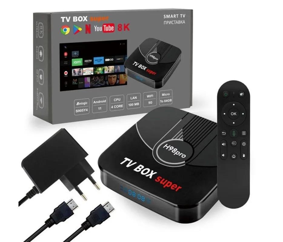 ТВ ПРИСТАВКА СМАРТ H98pro 4G+64G, Amlogic S905Y4, Wifi 5G, MicroSD до 64Гб, LAN 100Mb, CPU 4 CORE