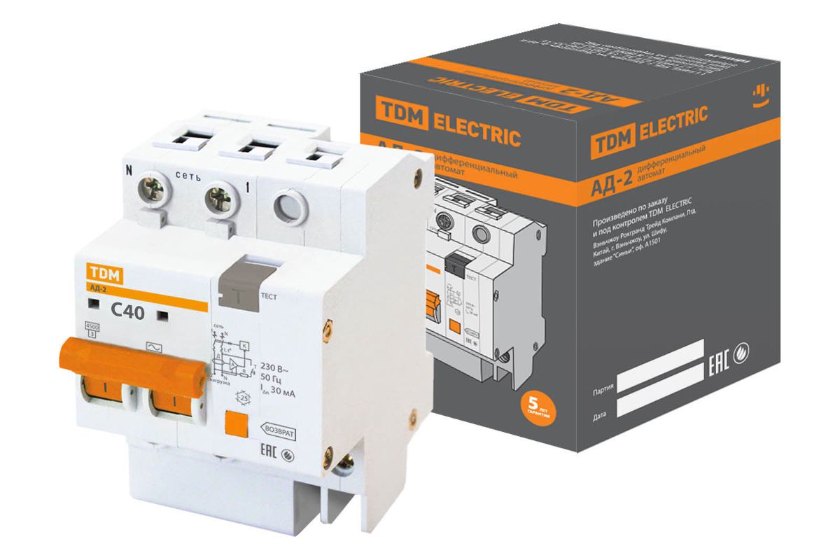 ДИФФЕРЕНЦИАЛЬНЫЙ АВТОМАТ 2P C40 30мА АД-2 TDM (Отключение тока утечки и тока перегрузки)