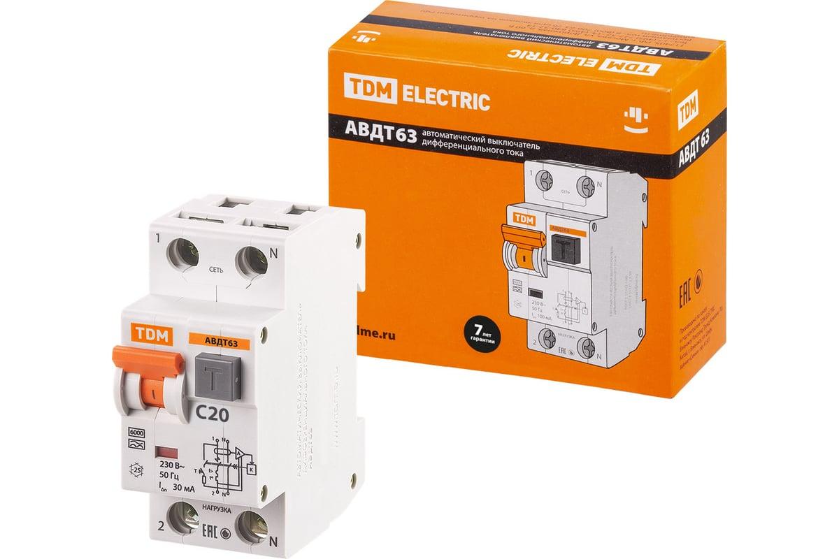 ДИФФЕРЕНЦИАЛЬНЫЙ АВТОМАТ 2P C20 30мА АВДТ-63 TDM (Отключение тока утечки и тока перегрузки)