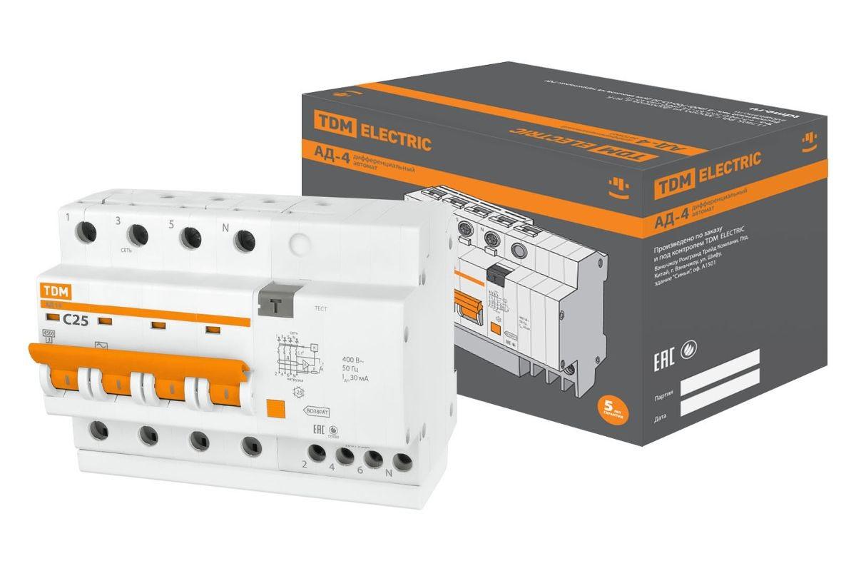 ДИФФЕРЕНЦИАЛЬНЫЙ АВТОМАТ 4P C25 30мА АД-4 TDM (Отключение тока утечки и тока перегрузки)