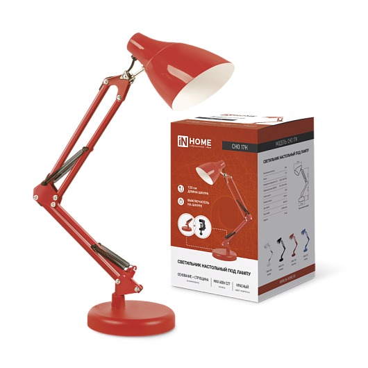 СВЕТИЛЬНИК НАСТОЛЬНЫЙ Е27 IN HOME СНО-17К 60Вт ОСНОВАНИЕ + СТРУБЦИНА, кабель 1м, красный