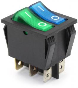 ПЕРЕКЛЮЧАТЕЛЬ УСТ.:28*22мм ДВОЙНОЙ 2-ПОЛОЖЕНИЯ С/Ф 6PIN 15A С ПОДСВЕТКОЙ ЗЕЛ+СИН SWR 2101-1C3