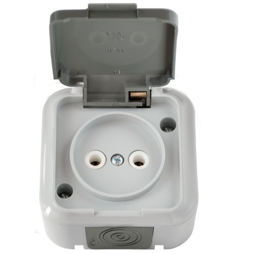РОЗЕТКА ОП 1М Б/З СЕРАЯ С КРЫШКОЙ ПРАЛЕСКА IP54