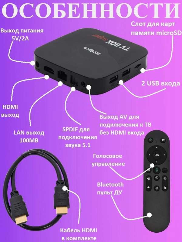 ТВ ПРИСТАВКА СМАРТ H98pro 4G+32G, Amlogic S905Y4, Wifi 5G, MicroSD до 64Гб, LAN 100Mb, CPU 4 CORE